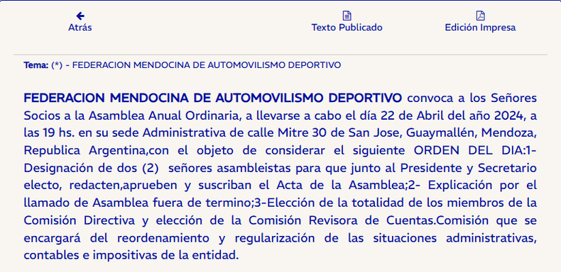 La Federación Mendocina de Automovilismo Deportivo convoca a los señores socios a la asamblea anual ordinaria, a llevarse a cabo el día 22 de Abril del año 2024, a las 19, en su sede administrativa de calle Mitre 30 de San Jose, Guaymallén, Mendoza, Republica Argentina