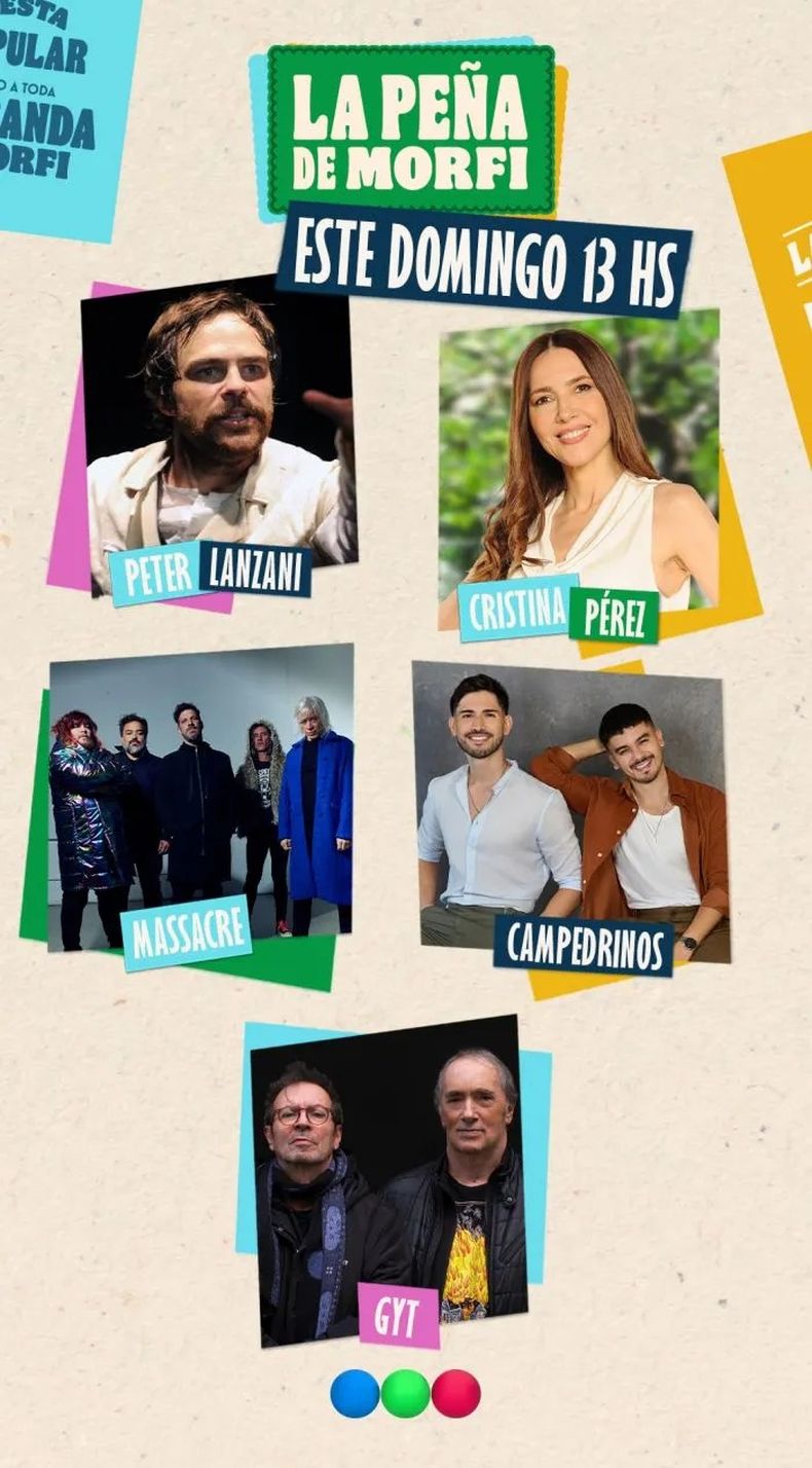 En esta nueva entrega, La Peña de Morfi reúne a artistas del folclore, el rock y el pop para ofrecer una tarde llena de música en vivo, humor y emociones. Entre bandas consagradas, nuevas voces y figuras de la televisión, el programa promete una jornada variada y con mucha energía.
