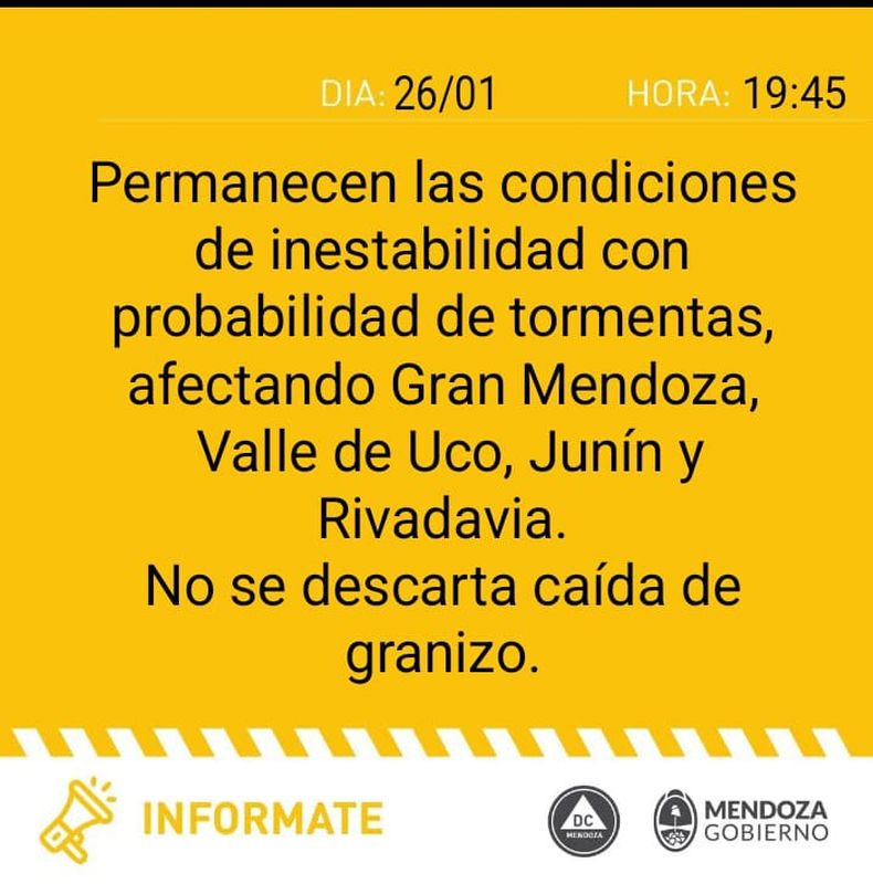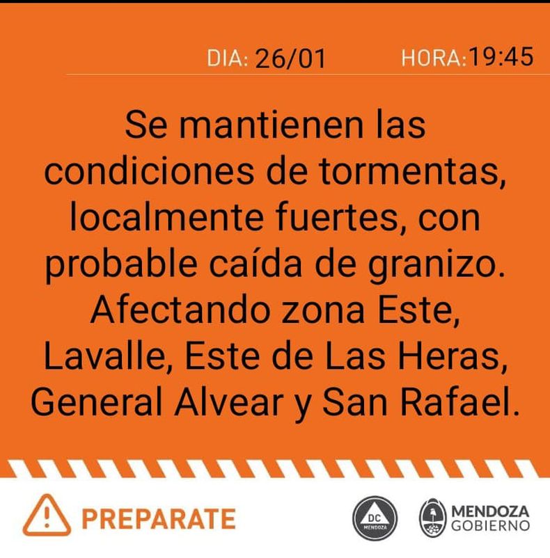 Defensa Civil de Mendoza emitió un alerta para informar que “se mantienen las condiciones de tormentas, localmente fuertes, con probable caída de granizo”. La preocupación radica en la extensión del territorio afectado. Es que el Gobierno de Mendoza informó que las lluvias con granizo podrían ocurrir en casi toda la provincia: